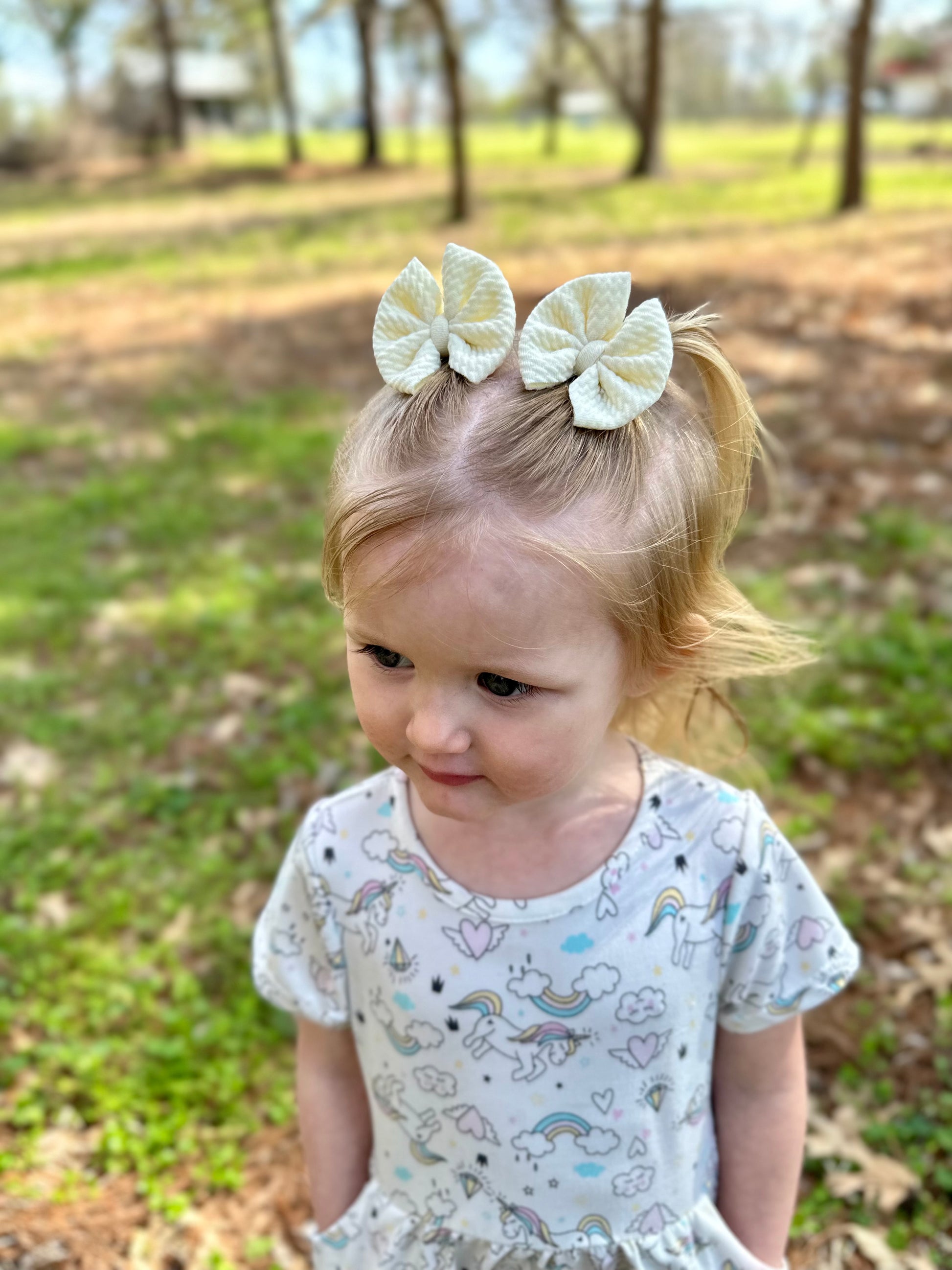 Our piggie bows are hand tied using the no flap method. Our piggies come in a pair of two bows and offered with fIve different size options. Big piggies, small piggies, mini piggies, micro piggies, or teeny piggies