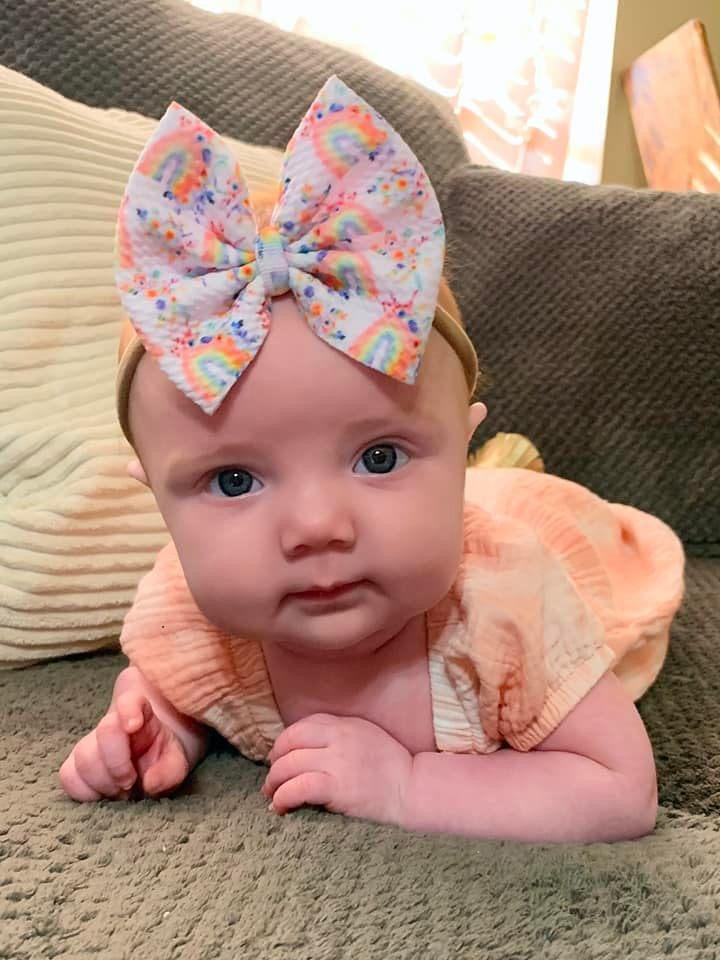 Ava & Millie Co.‘s stylish hand tied bow on your choice of a nylon headband or alligator clip in After The Storm print. All of our bows are tied to perfection using a no flap method.