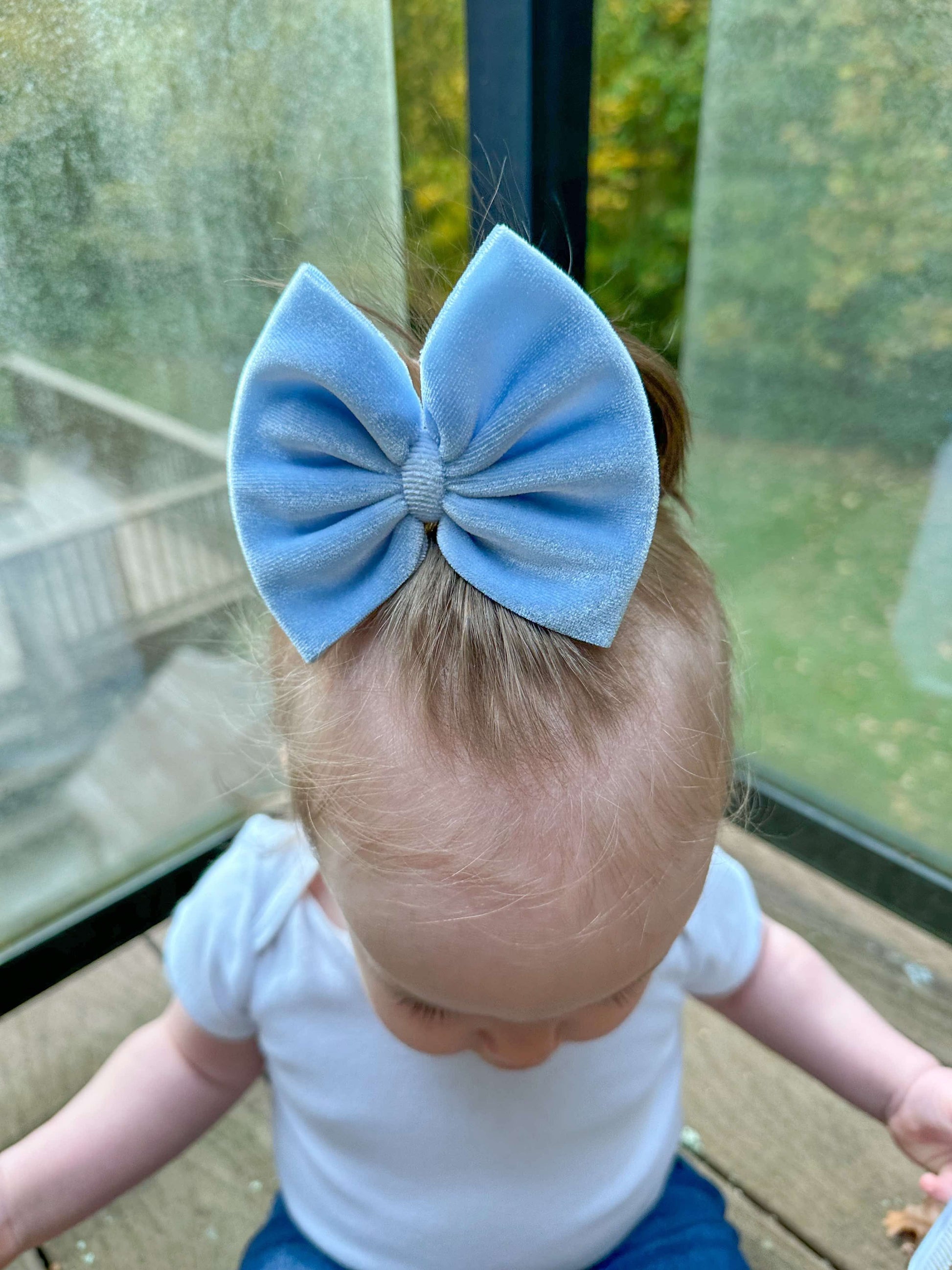 Ava & Millie Co.‘s stylish hand tied bow on your choice of a nylon headband or alligator clip in Baby Blue Velvet. All of our bows are tied to perfection using a no flap method.