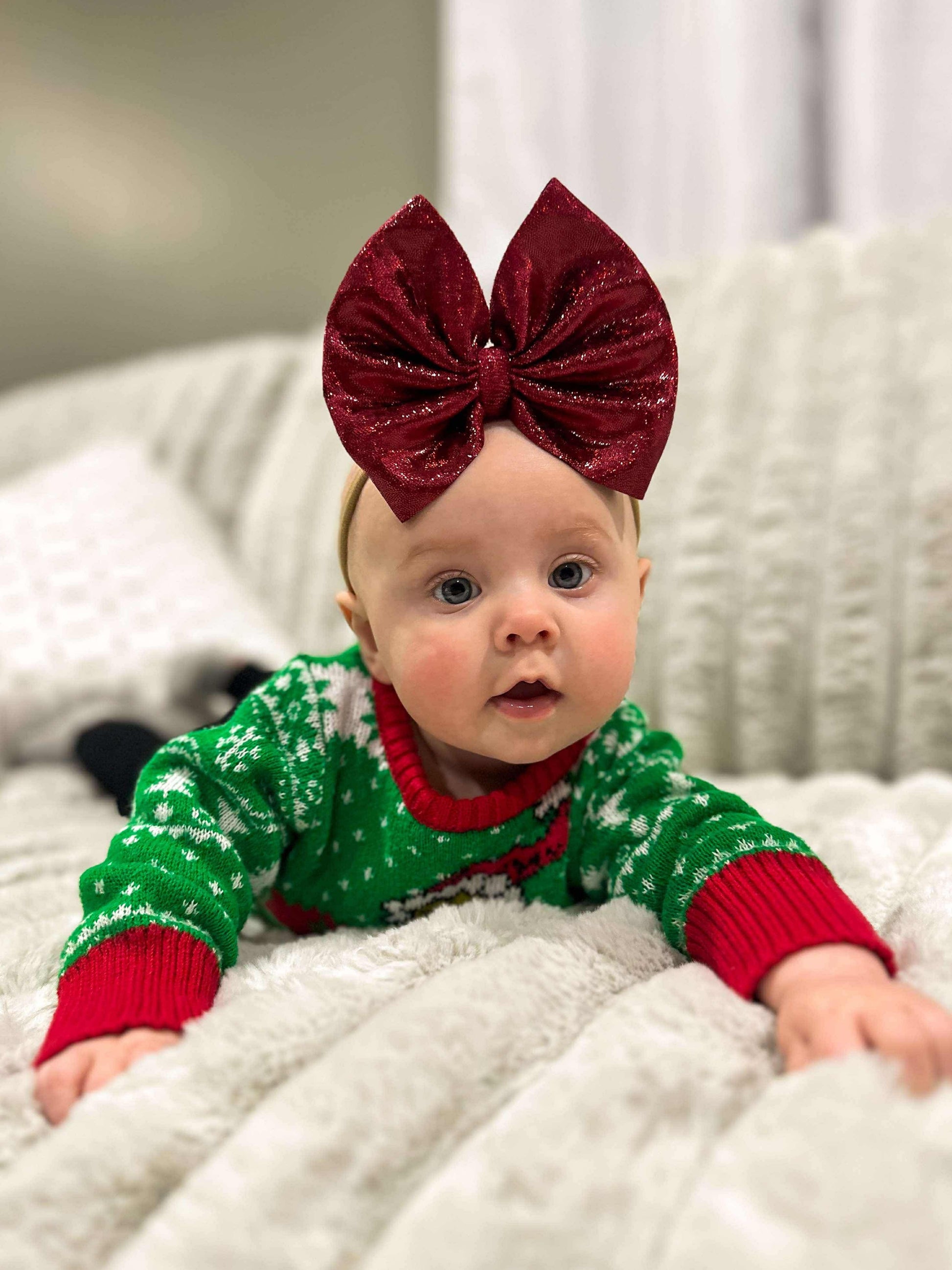 Ava & Millie Co.‘s stylish hand tied bow on your choice of a nylon headband or alligator clip in Wine Glimmer. All of our bows are tied to perfection using a no flap method.